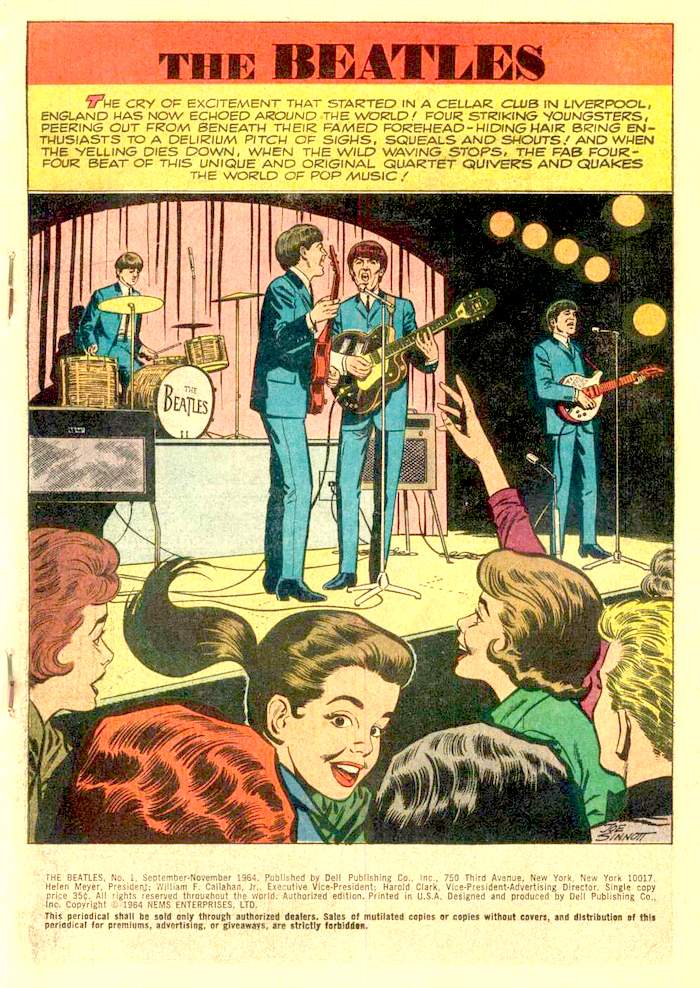 The Beatles v1 #1, 1964 - Arguably the most sought after Beatles comic book of all, this Dell Giant touts stories, pin-ups and color photos. In addition to how the Beatles got together, there's a biographical chapter on each member: George Harrison, John Lennon, Ringo Starr and Paul McCartney. Note that this 64-pager, drawn by Joe Sinnott, came out the same year as the band's American debut on the Ed Sullivan Show. Photo cover. /// key 1st appearance in comics Beatles, 1st issue, Specialty issue